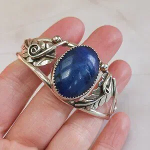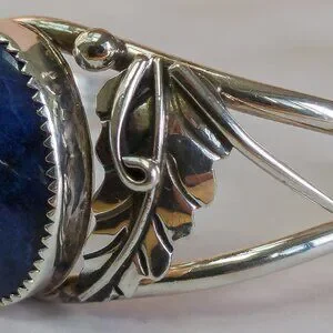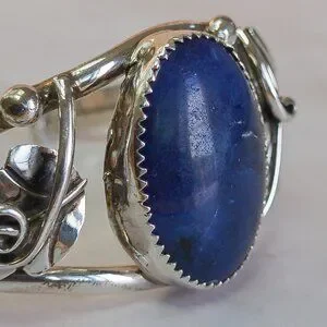 A beautifully crafted Navajo cuff bracelet in solid sterling silver, featuring a striking deep blue cabochon—likely lapis lazuli—set in a bold, traditional leaf and scrollwork design. The stone is bezel-set and framed by hand-formed silverwork, a signature of skilled Native American craftsmanship.