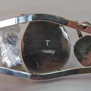 The inside of the cuff is stamped “T Sterling” in a serif italic font. While we haven't been able to confirm a specific artist, the styling is consistent with mid-to-late 20th century Navajo work, and the quality speaks for itself.