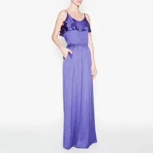 BCBGeneration Women's Maxi Flounce Dress Excellent pre-used condition (worn once). There are a couple small snags (barely noticeable) by the pocket (shown in last photo) 100% Polyester Machine Wash This dress has adjustable straps This dress has an elastic waist and no closures.