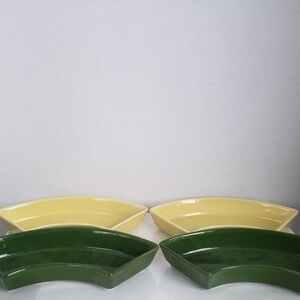 This item is a set of vintage Mid-Century Modern ceramic serving dishes, often used as lazy Susan inserts, likely from a California-based pottery company. They feature solid, contrasting green and yellow glazes and are designed to fit together in a circular arrangement, typically around a central bowl and often on a wooden base (not pictured).