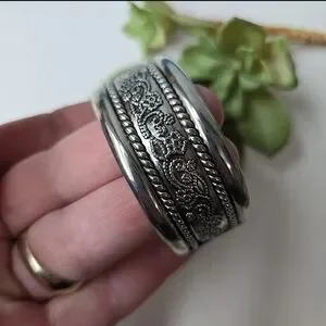 Elegant silver cuff bracelet with intricate detailing. Perfect for any occasion.