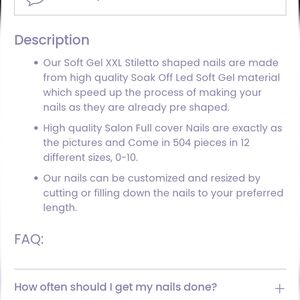 Soft Gel XXL Stiletto shaped nails are made from high quality Soak Off Led Soft Gel material which speed up the process of making your nails as they are already pre shaped.