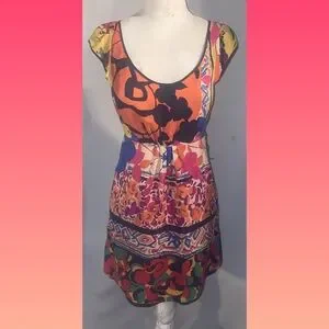 Moulinette Soeurs silk Dress Women Size 4 Silk Mini Abstract Art Belted Anthropologie. Condition is Used. Vibrant dress with an abstract print. Features a mix of orange, pink, blue, and black colors. With pockets