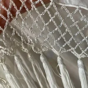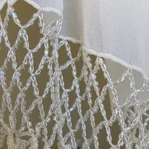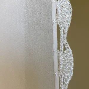 An elegant wrap sure to dress up an evening outfit or a bride! Crocheted edges and on each end, which is combined with iridescent beads, is a total eye catcher. Solid cream /egg shell color. Approx measurements (excluding the beaded, crocheted and tasseled ends): 72” long, 23” wide. Be sure to look at the photos to see all the beautiful details in this wrap!