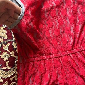 Elegant red lace sleeveless dress with a gray tank top-style lining. Perfect for any occasion. The dress has a fitted bodice and a flared skirt, the lace pattern features small red pattern floral designs. The color is bold and bright.