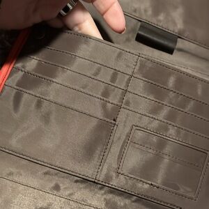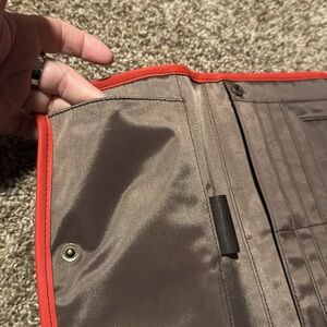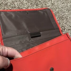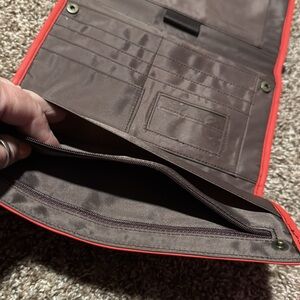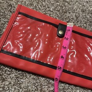 High-quality, well stitched oversized travel wallet has plenty of zippered compartments & card slots, ID window, and clear full-length pocket on back for cell phone (use touch screen thru the plastic). Perfect to organize all your items for travel or daily use - just toss it in your bag and go! Material is a sort of polyurethane but not sure of exact material. Tomato red outside and clean brown fabric-lined interior. Brass-like hardware.
