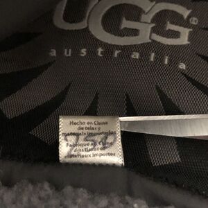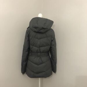 This UGG puffer jacket is perfect for the colder months. The mid-length coat features a softshell fabric type with a solid gray pattern, and a stand-up collar style. The closure consists of both a zip and snap, and the jacket includes various accents such as a belt, zipper, hood, and logo.
