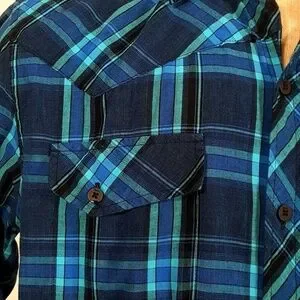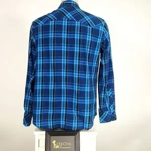 Men's blue long sleeve plaid shirt by Hawk. Shirt is a size Large. Armpit to armpit 22", sleeve 25.5". pre-owned in excellent condition no stains or holes. (BM18-BM1)