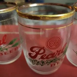 •clear glass, gold rims, with logo xXx, Pearl in script and BEER all in red lettering with green stalks of barley