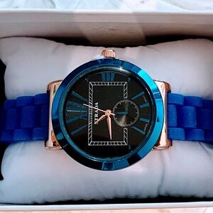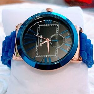 Stylish blue and black watch by STRADA. Features a bold blue band and black face with rose gold accents.