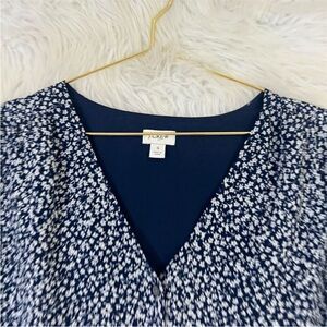 J.Crew Factory Women's Cropped Blouse - Regular Size, Blue Floral Pattern. This V-neck top features short flutter sleeves, made from polyester. Its a pullover style that's machine washable. Excellent Pre-owned condition.