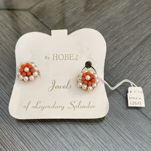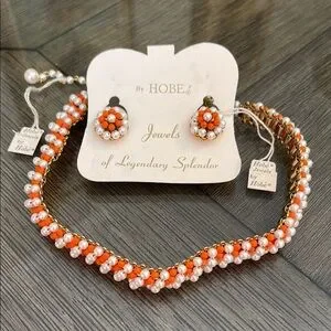 Vintage Hobe Orange and White Beaded Necklace and Clip Earring Set with Tags