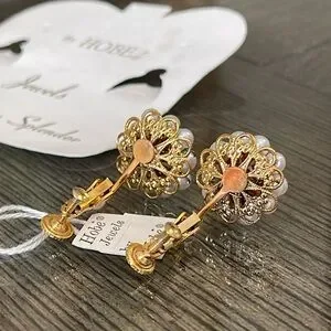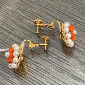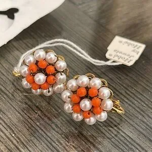 Earrings and necklace are faux white acrylic pearls and tiny acrylic orange beads.