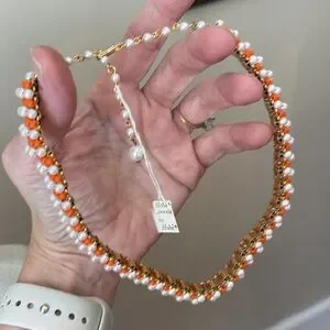 Elevate your style with the beaded necklace and earring set. Featuring vibrant orange and classic white beads, this set adds a touch of elegance to any outfit.