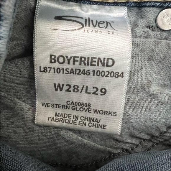 Silver boyfriend jeans with distressing. Holes have material behind them. Have some stretch. Preloved. W28 L 29.