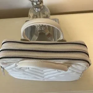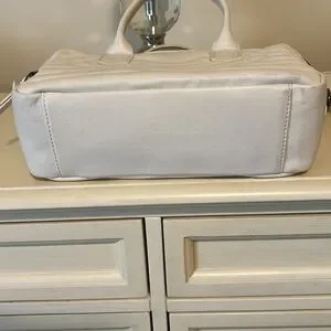 Used 1x. Elegant white quilted handbag/crossbody. Sleek design. Genuine leather, spot on the bottom I think it’s part of the leather. 6” h x 11” w. Adjustable/removable strap. 3 zippered compartments. Inside: 1 zippered pocket, 1 large pouch
