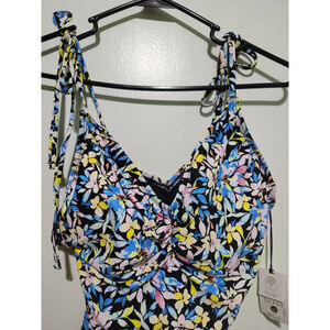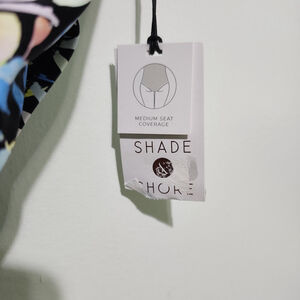 This is a new with tags Shade & Shore one-piece swimsuit. The swimsuit features a black background with a floral pattern in shades of blue, yellow, and pink. It has a V-neckline and adjustable straps. The swimsuit is made of a stretchy material, likely a blend of nylon and spandex. The tags are attached and indicate medium seat coverage. There are no visible imperfections.