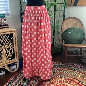 Washed red with white polka dots. Handmade. Metal side zip with single button closure. Ruffled bottom hem. Midi to maxi length depending on height of wearer. No size or material tags. Feels like a lightweight cotton. See measurements for fit. Excellent used vintage condition - no rips, tears, or stains. Measurements are approximate and taken laying flat.