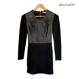 NWOT HELMUT LANG black long sleeve mini dress with super soft, buttery lambskin leather accent at top. Material on bottom is thick & very stretchy. Scoop neck. Zip closure at back. Fitted sheath style. Tonal stitching throughout. Perfect LBD - little black dress. Style name: SW-CS1506H. Style#: D07HW607. Lot#: 255054. New without tags. Pristine. No flaws. Never worn. Measurements (approx/laying flat): 17” bust, 15” waist, 16” hip, 24” sleeve, 33” length. Fabric: 66% rayon, 31% nylon, 3% spandex; panel: 100% lamb leather. Made in USA. Size Small. Retail $695.