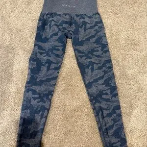 These NVGTN leggings offer a sleek, form-fitting silhouette with a high waistband for added support. The blue seamless design is crafted from stretchy, athletic fabric, perfect for both workouts and casual wear. Great condition.