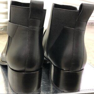 Pointed toe Black leather ankle boot with decorative strap and elastic goring.