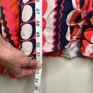 This elegant dress by Vilagallo features a vibrant orange and blue palette, perfect for a wedding guest occasion. The long bishop sleeves and crew neck add a touch of sophistication. Ideal for making a stylish impression at any event.