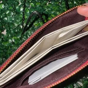 Stylish and elegant, this Coach wristlet wallet in vibrant red is perfect for any occasion. Featuring a sleek design, it adds a touch of sophistication to your ensemble. Featuring heart flower print on both sides.