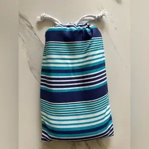 ◦ Quick-drying, sand-free beach towel with a reusable tote bag ◦ Features reversible design with blue and aqua stripes ◦ Compact and great for travel ◦ Lightweight fabric dries faster than traditional terrycloth beach towels ◦ Smooth surface helps repel sand ◦ Made with 88% polyester, 12% polyamide ◦ Oversized beach towel measuring 38 x 72 inches ◦ Machine washable for quick and easy care