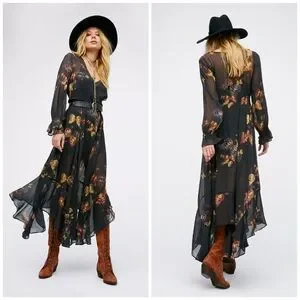 Free People Butterfly Skies Black Sheer Handkerchief Asymmetrical Smocked Waist Cuffs Long Sleeve Dress XS