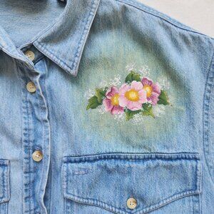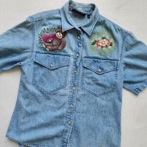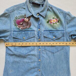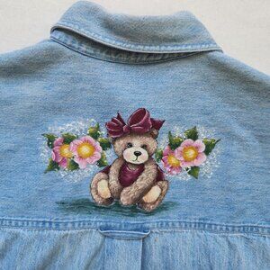Adorable vintage denim shirt with hand-painted teddy bears, flowers and hearts on the front and back. The material is a heavier weight denim, short sleeves and button up front. The shirt brand is Prestwyck, Size Medium.