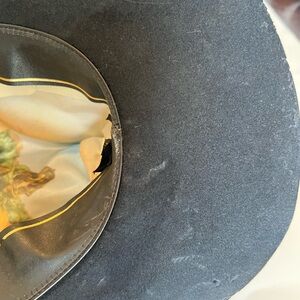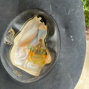 Stylish black wide brim hat by Stetson. Features a sleek design with a decorative band.