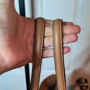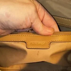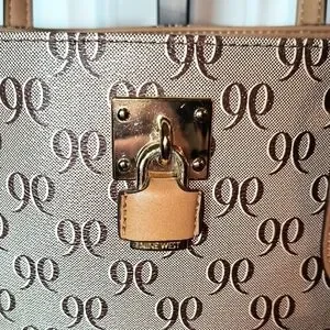 Nine West. Super Cute Larger Size Tote Purse/Handbag. Vegan Leather. Beige/brown signature 9 print with beautiful floral detail in pinks/greens. Gold-tone Hardware & stud accent on the front. 4 Gold-tone feet on bottom to protect it. Gold-tone lock accent on the front embossed with NINE WEST. Matching Keychain hangtag. One larger main interior compartment in a silky beige lining with zipper closure. Inside has a zippered section and 2 pockets. Behind the main compartment is another large section with magnetic closure. Gently Used. Great overall condition. No rips/tears/gouges. Gold-tone lock has a few scratches. No major stains inside. Feel free to message me with any questions you may have. Open to offers. Thanks and God Bless.