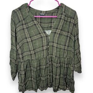 Torrid Plus Size Green Plaid V-Neck Babydoll Blouse Long Sleeve Casual Women