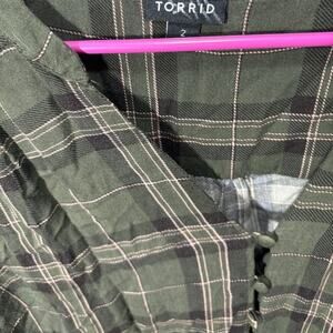 For a look that's effortlessly chic and ready for your day-to-day, the Torrid Plus Size Babydoll Blouse is a perfect addition to your wardrobe. This green plaid blouse, with its flattering V-neck and long sleeves that roll up for a touch of casual flair, offers a comfortable regular fit that's just right for any casual occasion. The button-front design adds a classic touch, making it ideal for a brunch with friends or a relaxed day at the office. Easy to care for and machine washable, this blouse is as practical as it is stylish. While pre-owned, it only shows some wrinkling from storage and is free from rips, stains, or tears, ensuring you a quality garment with plenty of life left.