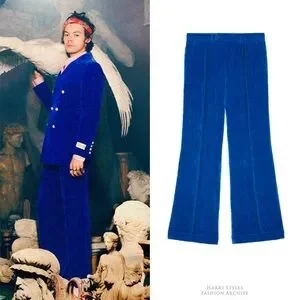 For sale are a pair of blue velvet flared pants in linen-cotton blend from Alessandro Michele’s Gucci, first shown in the Pre-Fall 2019 campaign.