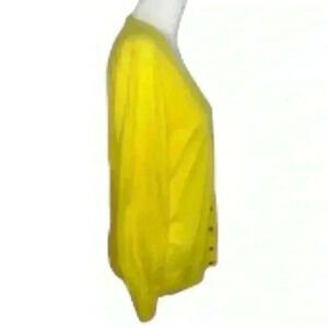 The Classic V-Neck Cardigan in a Cheerful Canary Yellow is Sure to Brighten Ones Day. This lightweight and soft yarn sweater is a great layering piece, with its tortoise buttons (hidden extra button), ribbed banded cuffs and ribbed banded hem. Making it the pertect transitional sweater-weather. This item is in very good condition with minor signs of wear.