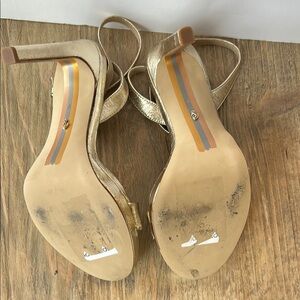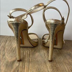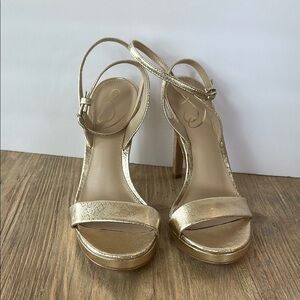 Sam Edelman Jade Gold Rounded Open Toe Stiletto Heeled Ankle Strap | 9