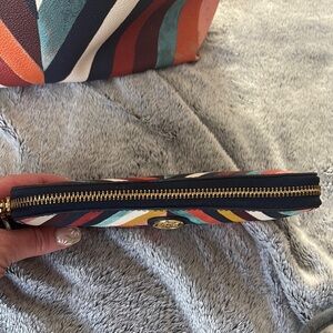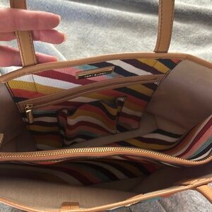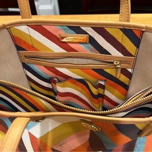 Elevate your style with the Tory Burch Multicolor Kerrington Tote and Wallet Set. Featuring a vibrant mix of colors, this set is perfect for adding a pop of color to any outfit. The tote and wallet both showcase the iconic Tory Burch logo, ensuring a touch of luxury and sophistication. Tote is accompanied by the Tory Burch logo bag charm/key chain. Tote and wallet are in EUC with no call outs.