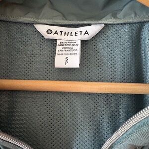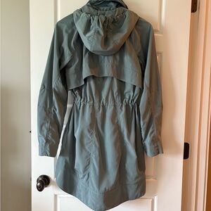 Stay stylish and comfortable with this Athleta hooded rain jacket. Adjustable cinched waist. Zippered pockets. Lightweight and water resistant. Hood rolls up into collar. Color is a light green/gray.