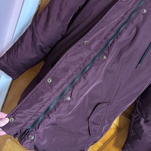 Excellent condition burgundy colored parka style winter coat. Faux fur lined hood, doesn’t detach. Women’s size US extra small but measurements taken flat are approximately: