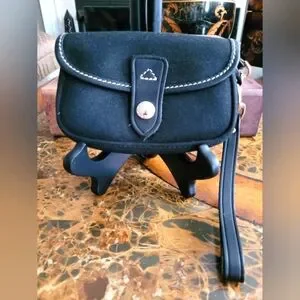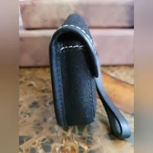 Dooney and Bourke Chic black canvas pouch with a sleek design. Features a button closure and adjustable strap. Perfect for any occasion.