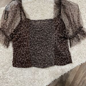 Altar'd State Medium Leopard Print Mesh Ruffle Puff Sleeve Smocked Crop Top