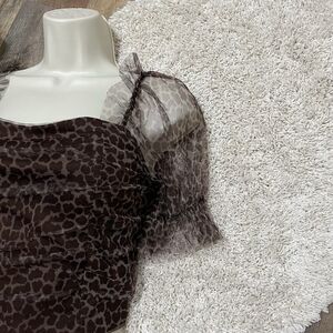 Brown and black, leopard print, mesh fabric, sheer puff sleeves
