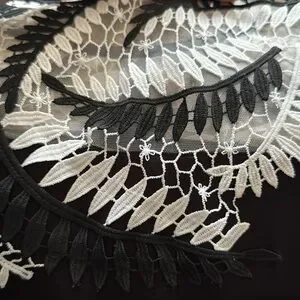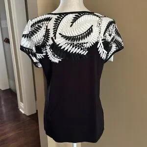 Stylish black top with intricate white lace detailing on the shoulders. Perfect for casual or dressy occasions. This looks great under a black jacket or as a stand alone piece. One owner~