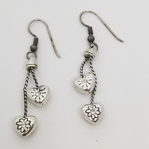 Lovely silvertone drop style earrings by Brighton. Earrings have silvertone heart charms detailed with flower designs and crystal accents suspended from dainty silvertoned chains. Earrings have hook backs and measure 2 inches tall. Great condition.