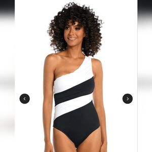 La Blanca Island Goddess Shirred One Shoulder One Piece,Black And White, Size 6