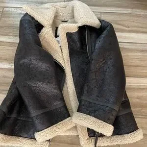 Stylish black jacket with cream shearling lining. Perfect for a chic look. By American Eagle