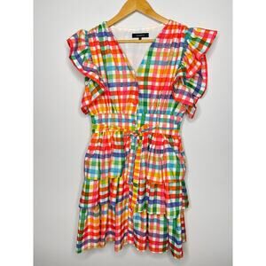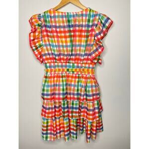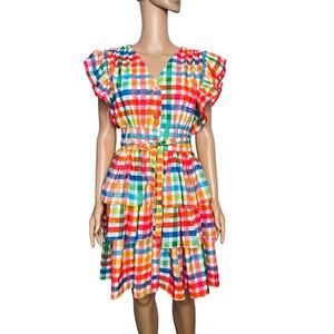 Colorful, short-sleeved dress with a gingham pattern and ruffled accents. The dress features a V-neck, button-down front, and a tie belt at the waist. It has tiered ruffles at the hem and on the sleeves.