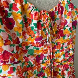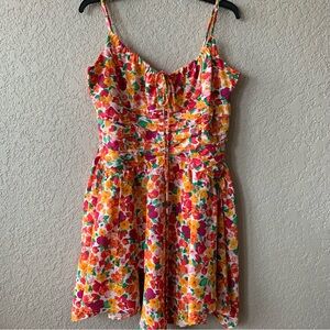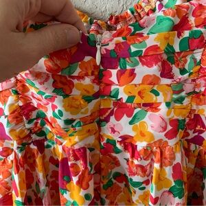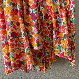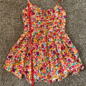 This size 8 dress features a vibrant and cheerful print with a mix of oranges, reds, pinks, and yellows on a white background.