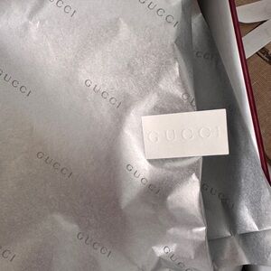 Authentic Gucci 2024 holiday gift wrap in burgundy, white and silver. Perfect for elegant or festive presentations.